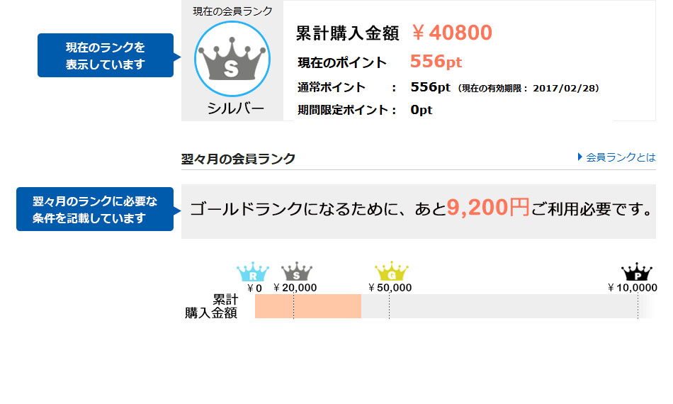 ●マイページでは前日までの累計購入金額をもとに、翌月のランクアップまたはランク維持のための条件を算出しています。